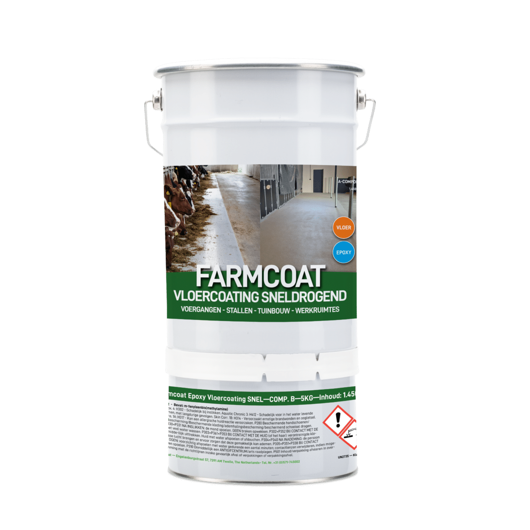 Farmcoat Vloercoating Sneldrogend is een zeer sterk en snelle 2-componenten epoxy coating voor vloeren. In tegenstelling tot onze normale vloercoating heeft deze snelle variant een uithardtijd van 6 tot 8 uur bij 15 graden. Bij hogere temperatuur is de uithardtijd sneller, bij lagere temperatuur langzamer. Deze sneldrogende coating is ontwikkeld voor ruimtes waar een lange droogtijd niet mogelijk is; bijvoorbeeld in melkputten. Met deze coating kun je tussen twee melkbeurten de melkput coaten. Farmcoat Epoxy Vloercoating Sneldrogend is enkel geschikt voor toepassing binnen. Farmcoat vloercoating sneldrogend heeft de hoogste resistentie tegen chemicaliën.