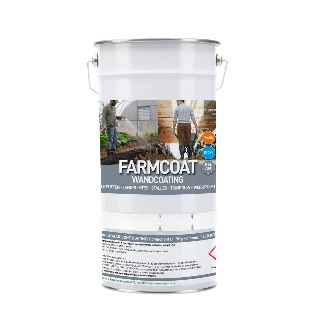 Farmcoat Epoxy Wandcoating is een zeer sterke 2-componenten muurverf speciaal ontwikkeld voor de agrarische sector. In 1 dag aan te brengen. Farmcoat Epoxy Wandcoating vormt een harde beschermlaag op muren van o.a. cement, stuc, gips, beton, hout (ook betonplex) en metaal. Daarbij geeft het een strak uiterlijk dat chemisch bestand, waterdicht, ijzersterk en makkelijk te reinigen is met hoge druk. De wandcoating is in bijna alle kleuren leverbaar. Geschikt voor allerlei agrarische wanden waaronder ook in rundveestallen en paardenstallen.