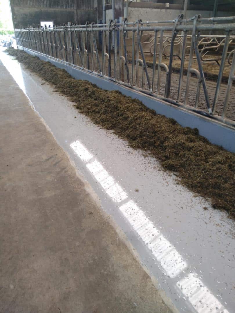 In Aalden werden de voergangen van deze melkveestal in oktober 2023 door de boer zelf gecoat. een groot project van maar liefst 150 meter lengte aan voergang. De voergang werd met een breedte van 1,5 meter aangebracht.